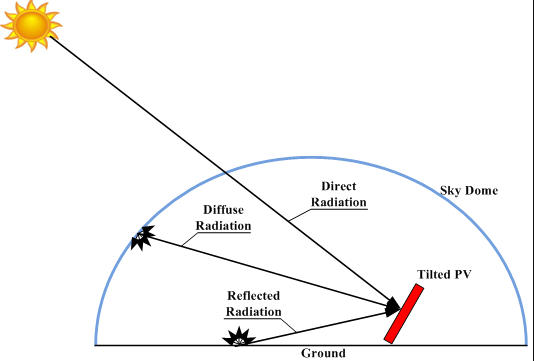 2. Direct radiation, diffuse radiation, and reflected radiation on a tilted PV module.