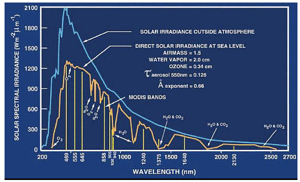 2. Comparison diagram of solar radiation spectra between the Earth’s surface and the top layer of the Earth’s atmosphere.