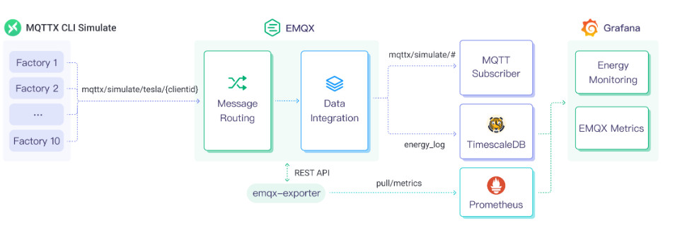 2. A typical architecture for integrating EMQX and TimescaleDB data in industrial Internet of Things.